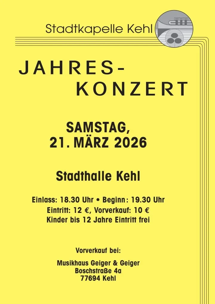 Auch in diesem Jahr lädt die Stadtkapelle Kehl unter der Leitung von Markus Göpper zum Jahreskonzert in die Stadthalle Kehl ein. Von Irland bis Brasilien, von Disney bis Queen – freuen Sie sich auf einen abwechslungsreichen Abend mit vielen Facetten der Blasmusik.